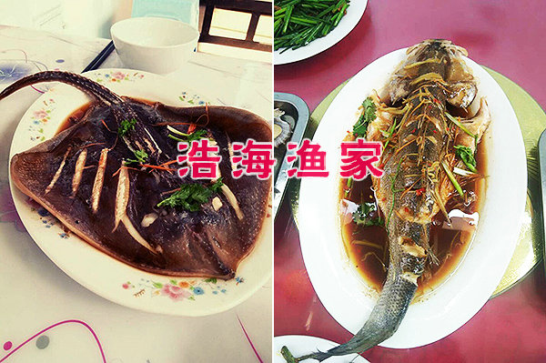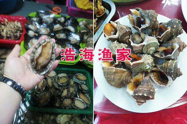 海鮮有 爬蝦、海膽、螃蟹、大對蝦、魷魚、八爪魚、扇貝、海虹、牡蠣、海參、鮑魚﹑江珧貝﹑夏邑貝﹑海牛牛﹑海螺,海蜇湯、 海菜包子、鲅魚水餃﹑等各種海鮮。
